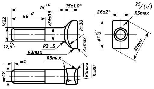 • Класс точности: B. • Класс прочности: 4,8. • Поле допуска резьбы: 8g. • Масса 1000 шт: 320 кг. Пример условного обозначения клеммного болта класса точности В, диаметром резьбы d=22мм, с крупным шагом резьбы, с полем допуска 8g, длиной 75 мм, класса прочности 3.6, из спокойной стали, с цинковым покрытием толщиной 9 мкм, хроматированным: Внимание! |